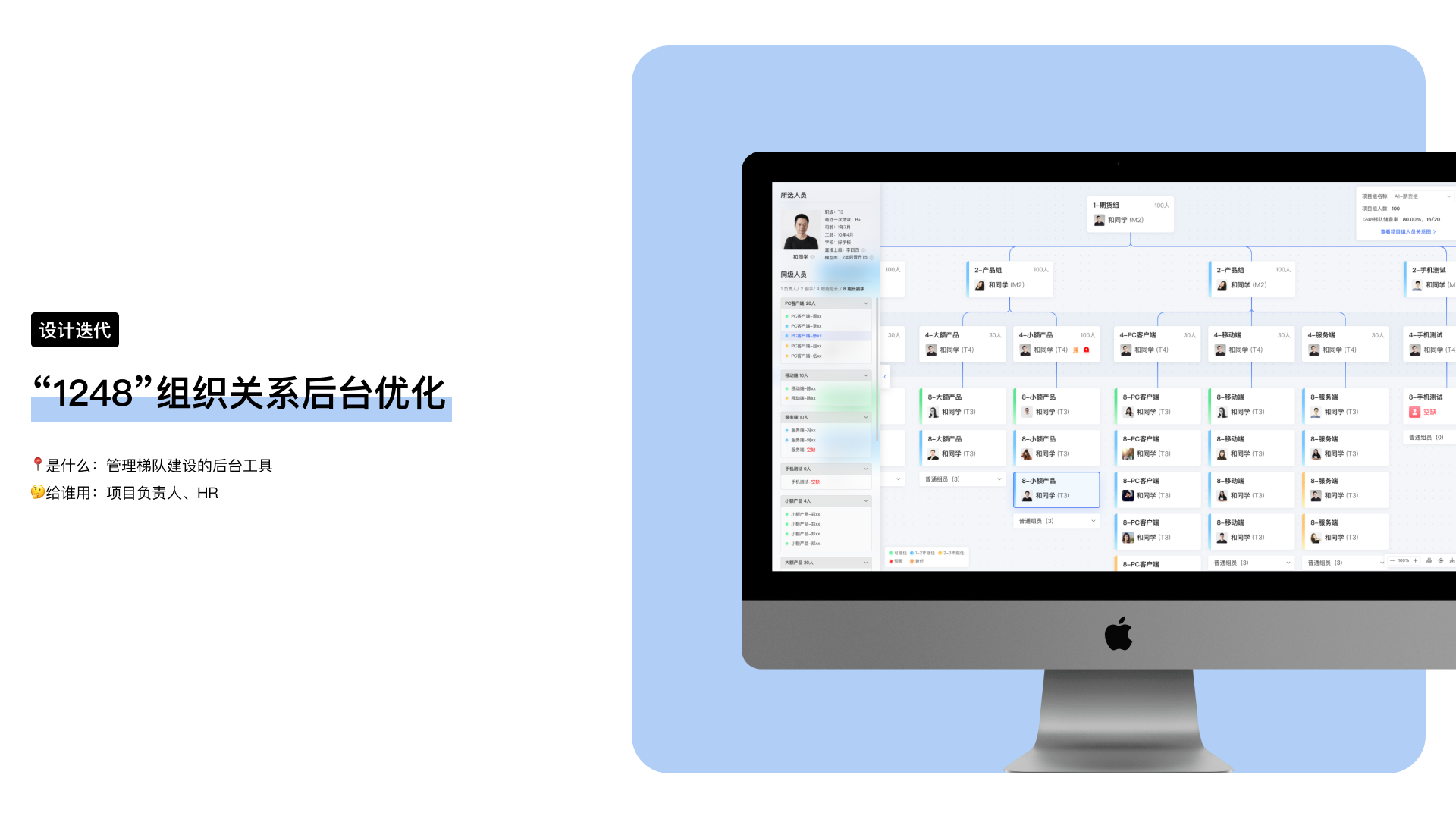 “1248”是管理梯队建设的后台工具,可以从项目组视角帮助管理者掌握团队现状和人员发展方向。 现有版本已无法满足大体量关系数据的编辑,需要进行设计迭代以提供更便捷的操作方式和更清晰的信息展示,提高使用者的效率。