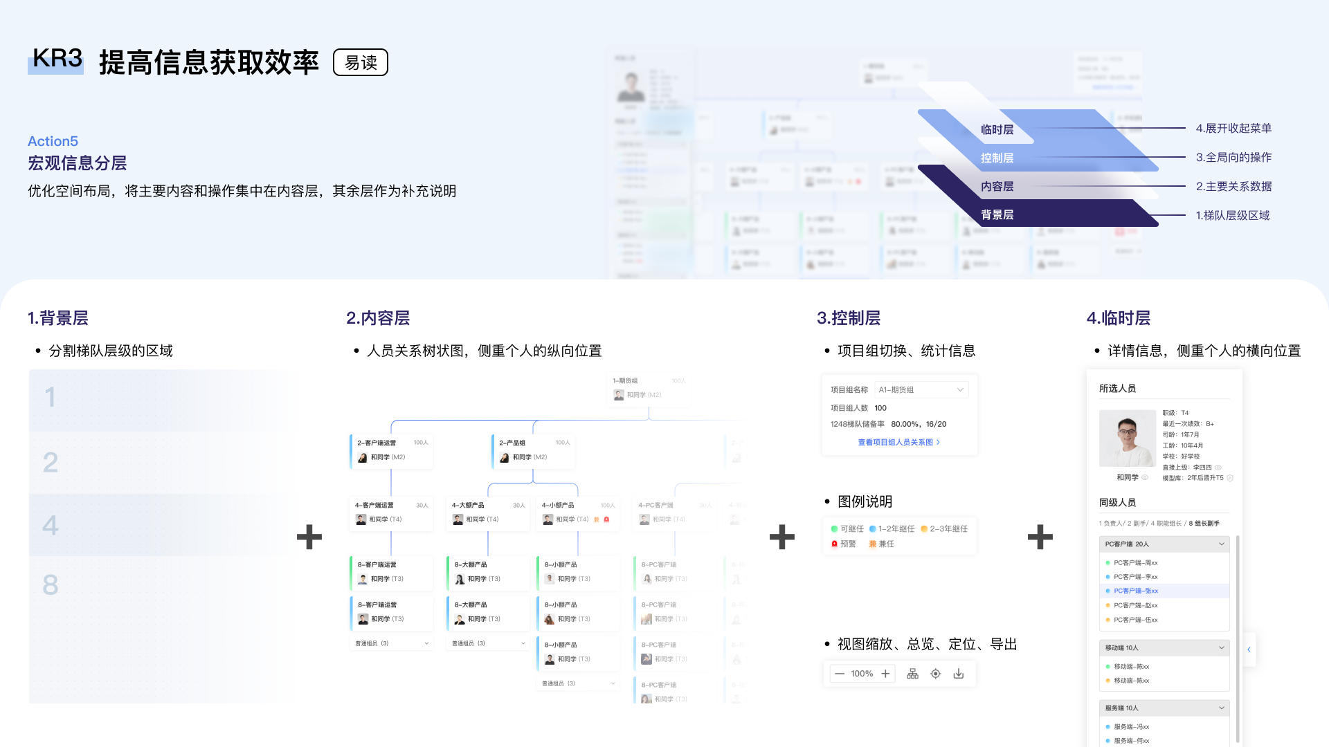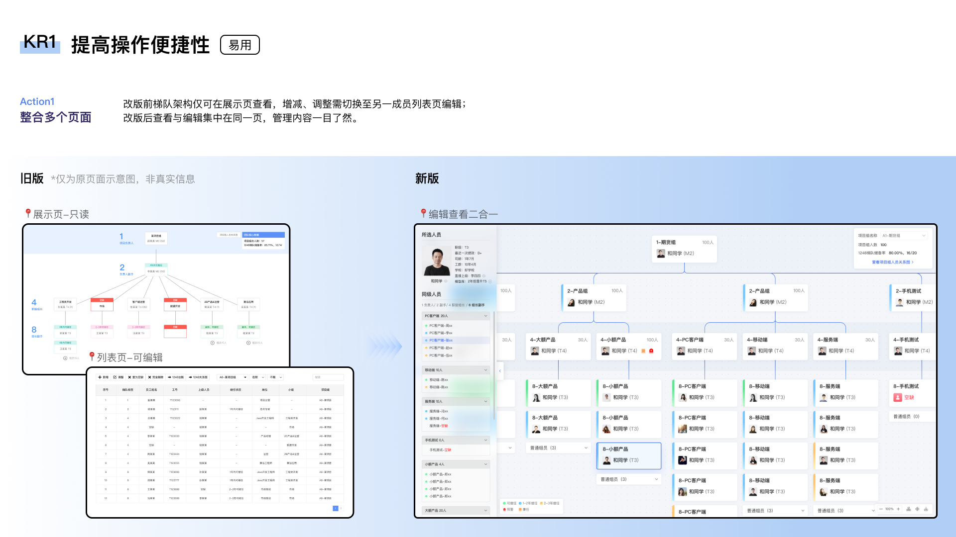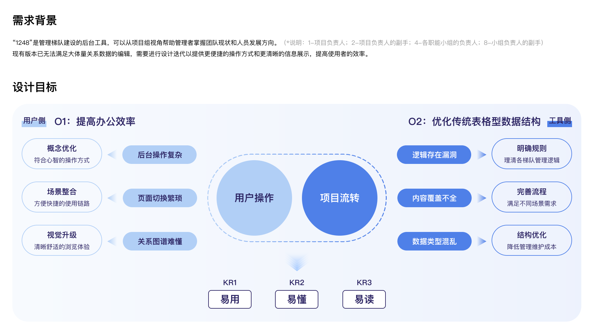 “1248”是管理梯队建设的后台工具,可以从项目组视角帮助管理者掌握团队现状和人员发展方向。 现有版本已无法满足大体量关系数据的编辑,需要进行设计迭代以提供更便捷的操作方式和更清晰的信息展示,提高使用者的效率。
